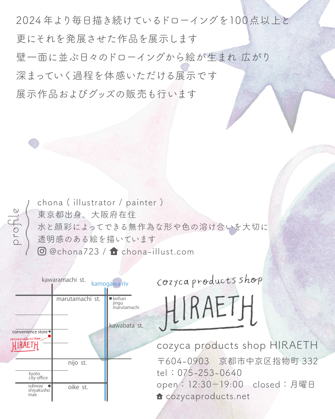 今回はいつもより大きい一枚絵の新作もご用意していますので、いつも見守ってくださっている方にも、はじめましての方にも楽しんでいただける展示になると思います。